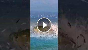 Experience the thrill of the ocean's food chain in action! A mesmerizing small fish dart and jump in unison, their movements a blur. But then, a monster from the deep strikes, sending the school into a frenzy. The big fish attacks, its powerful jaws snatching up the unsuspecting little fish. It's a heart-pounding, action-packed scene that'll leave you on the edge of your seat.