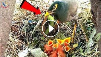 - myna bird feeding baby birds in nest, mother bird feeding baby birds, baby bird feeding