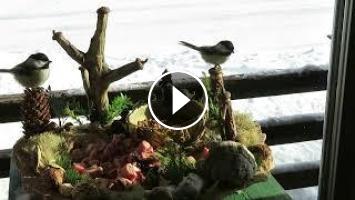 Si vous pouvez visionner en mode plein écran afin de bien voir les Mésanges à tête noire et 2 Sittelles à poitrine rousse venir chercher des vers de farine placés dans une petite mangeoire sur le plateau. J'ai installé ce set-up près de ma fenêtre et je peux ajouter des vers de farine sans avoir à sortir à l'extérieur dans la neige.