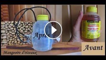 Voilà une vidéo pour créer une mangeoire d'oiseaux avec un très petit contenant en plastique de miel. L'important c'est le gobelet de débit en forme du tunnel. Je vous donne le lien de ma playlist sur les mangeoires munies d'un gobelet « tunnel » 20 montages vidéos