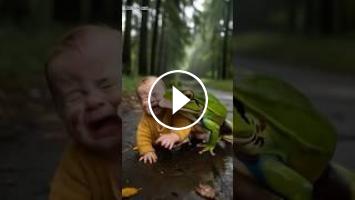 a huge frog was chasing a baby in forest but fortunately there was black cat to save him from the monster .