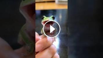 あまりの食べる早さに思わず相手の顔を見てしまうカエル