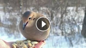 A Mourning Dove visits the Hand of Snacks! These birds like to sit and stay awhile. A Downy Woodpecker does a few fly-bys to encourage the Dove to leave but the Dove takes his/her time at the buffet. Video switches to real time around 5:30 mark.