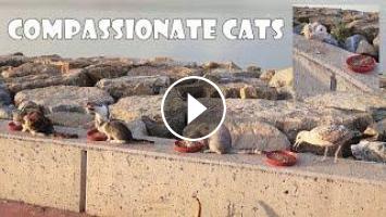 Hungry stray cats who hate birds, share their meals with a seagull with a broken leg. People can learn to be compassionate from animals. Adorable Paws