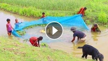 Amazing net fishing video-Village fish hunter catching fish by net in natural cannal-Fishing village