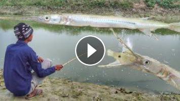 Little Boy Hunting Catching Garfish fish By Hook ~ Trandition Hook Fishing in The Village River ????????Little Boy