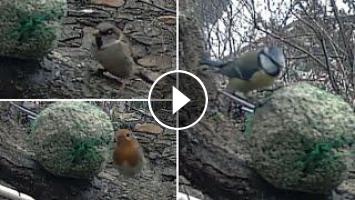 Les moineaux, mésange bleue et rouge gorge mangent dans l'arbre