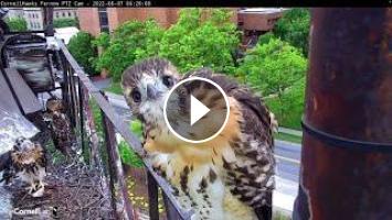 Red-tailed Hawk nestling "L1" alights on the railing of the nest platform and "tip-talons" towards the cam for a close-up that keeps on giving! All eyes are on the soon-to-be fledgling while it feels the wind beneath its wings, flaps with reckless abandon, and eyeballs the camera for one of the cutest close-ups in Cornell Hawks history.