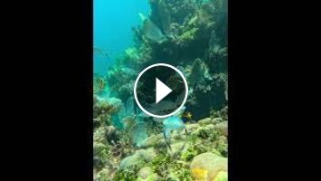 Coralscape of Bar Jack fish, Pez Carbonero, on coralhead in puerto morelos reef national park in riviera maya in caribbean sea.