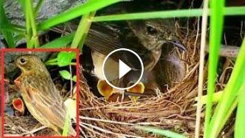 Ortolan bunting Birds - Mother takes care of 4 babies in a clean bird nest [ Review Bird Nest ]