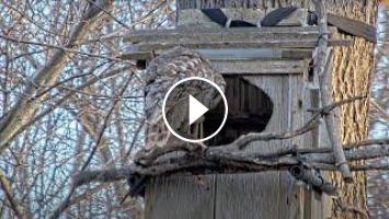 Time for a snake snack! Watch the male Barred Owl deliver a snake to his mate at the nest box from both cam views. He announces his arrival with a series of hoots and the female responds with some high-pitched calls before she swallows the snake down like a long spaghetti noodle.