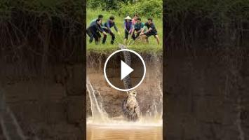 A dramatic moment unfolds at the riverbank — a cheetah is ambushed by a massive snake, but rescuers pull hard to break the deadly grip.