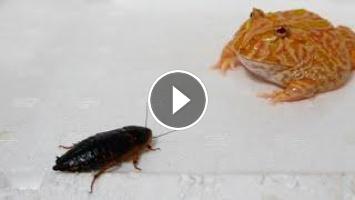 A very large cockroach is in front of the frog