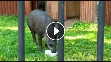 In captivity, the tapir lives in closed pens of at least 20 m2 in size and necessarily with a pond. They eat the same food as pigs: vegetables, fruits, grass, combined feeds. Due to the lack of sunlight, respectively, vitamin D, the animal may lag behind in growth and development. Therefore, vitamins and trace elements are added to the feed. And the delicacy, of course, will be sweet fruits, sugar, crackers.