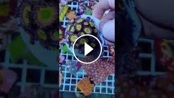 Zoanthus rainbow sur un gros plot en aquarium. Les zoanthus ne sont pas classés avec les coraux mous comme on pourrait le penser, ils sont classées a part.