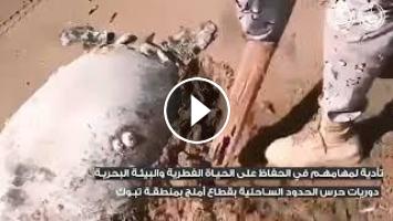 The Saudi border guards said in a statement: "Border guards in the Umluj sector in the Tabuk region returned a sea turtle to its environment after it was found buried on the beach."