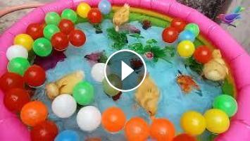 Cute baby Ducklings play with goldfish,Colorful Surprise Balls,4k aquarium,