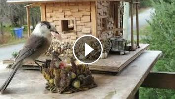 Les Geais bleus sont nombreux et les Mésangeais du Canada sont très heureux d'avoir du gras coupé en cubes. Vous entendrez les cris des Geais bleus, ils ont parfois une vingtaine à vider mes mangeoires de graines.