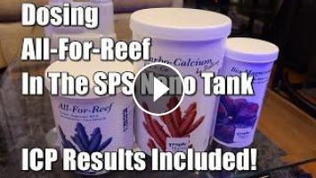 This video is an overview of how to dose Tropic Marin All-For-Reef in my SPS dominated nano tank to maintain Calcium, Alkalinity, and Trace elements. The video also shows my results from an ICP test after 7 months of using All-for-reef and an explanation of the difference between All-for-reef and Carbocalcium.
