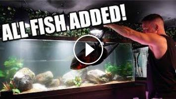The king of diy adds his oscars cichlids, fahaka puffer AND bichir to their new aquarium!!