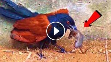 This greater coucal has found its next opponent: a mouse! Watch how it speeds over to its prey and instantly attacks it with a quick bite to the neck. The mouse never stood a chance! The greater coucal takes its time shaking and pecking at the mouse to assure it is dead...