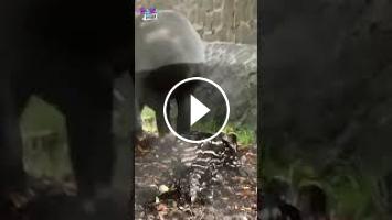 Este tierno animalito que parece ser producto del cruce entre un elefante y una cebra, es en realidad la cría de un Tapir Malayo o Tapirus indicus. Tienen el pelo oscuro con manchas claras que les permite mimetizarse con su entorno y así desorientar a sus depredadores, sin embargo este patrón desaparece entre los 4 y 7 meses de vida. El tapir malayo es un mamífero que habita en las selvas de Sumatra y la península de Malasia hasta el sureste de Birmania y actualmente se encuentra en peligro de extinción.