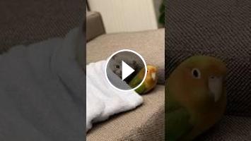 A heart-melting scene where a kitten and its parrot friend snuggle together under a warm blanket. This peaceful and adorable moment will brighten your day ????????????