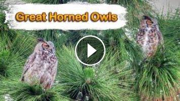 A pair of Great Horned Owls are going to raise a family high in a longleaf pine tree in the Backyard. These are huge high profile raptors day and night! Here they are out in the open in the top of the tree before sunset and its about time to go hunting! I think they are still in the courtship stage and eggs have not been laid yet. GHOs don' build nests but will likely use a large junction where the big main branches of the tree top spread out leaving a little bowl.