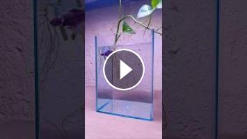 "A vibrant purple betta glides through a clear tank, weaving among the cascading pothos roots, creating a stunning contrast of color and nature.&...