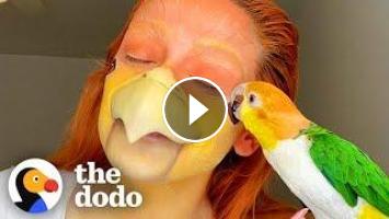 Bird who insists on taking showers with his parents has the cutest reaction when his mom uses SFX makeup to look like him...????