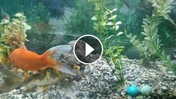freshwater colorful fishes playing in aquarium - koi and goldfish