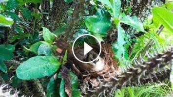 This nest is located in the crown-of-thorns plants. Parents find food to feed one chick in rainy day.