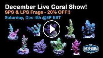 This live coral sale features premium, captive grown SPS Frags. Corals will be discounted during the live show through Tuesday, December 7th.