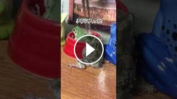 野生育ちの飼育アマガエルで体の大きな小太郎とあるじが、生き餌のコオロギを入れるお皿の上でご飯を食べるシーン。