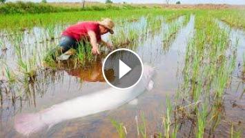 unbelievable this fishing! a lots of catch monster fish in rice field near the road by hand