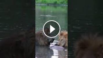 A lone kudu, trying to escape from a pride of lions, dives into a waterhole. The lions follow, wading through the water to pursue their prey. Despite the kudu’s efforts to evade them, the lions close in and take it down in a dramatic struggle.