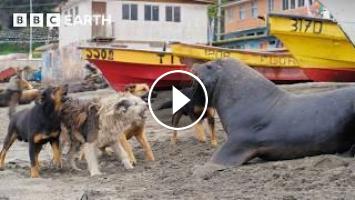 Sea lions are becoming regulars at the fish markets on the beaches of Chile. But for the stray dogs who were there first, a turf war is necessary to keep their territory.