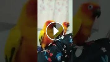 Two sun conures dance to their owner's singing.