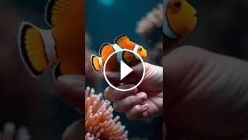 "A vibrant orange clownfish balancing on a finger, with coral reef scenery faintly visible around it."