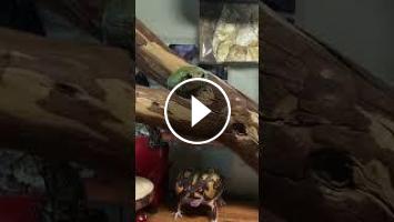 飼育アマガエルのそら豆が、高い位置のコオロギにジャンプ捕食した瞬間です♪