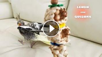 Lemon is a pied lutino cockatiel with grey pattern on the right wing. Lemon is naughty and lively. She can't leave people even for one moment, she is unable to stay in the cage for too long.