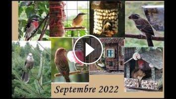 Je vous présente quelques uns des oiseaux qui sont venus aux mangeoires en septembre 2022. Sittelle à poitrine rousse, Colibri à gorge rubis femelle, Bruant à gorge blanche, Mésange à tête noire, Geai bleu, Gros bec errant mâle et femelle, Cardinal à poitrine rose mâle et femelle, Écureuil roux, Mésangeai du Canada et Roselin pourpré mâle.